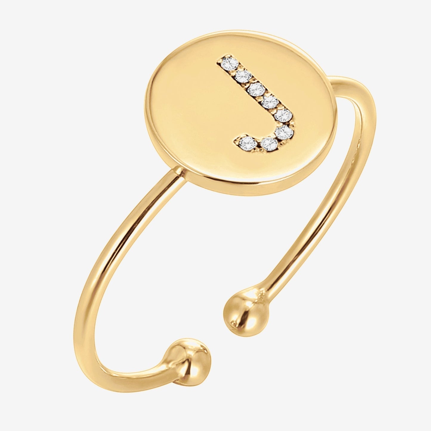 Initial impressions. The PAVOI 14K gold-plated initial ring features a round disc glimmering with an inset cubic zirconia initial. Whether you choose your initial or the initial of someone you love, this adjustable ring is beautifully personal and timeless.