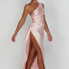 Feel like the goddess you are in Ariel, our premium gown made from luxury, lightweight satin with a stretch to hug your curves. With draped detailing and one shoulder design, the maxi dress sweeps the floor and is complete with a thigh high split. Style yours with sleek hair, a mini bag and heeled mules.