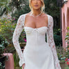Dreaming of dainty, delicate details? Meet Jacinta, your new fave mini made in luxury stretch floral lace with long, flared sleeves, a cupped bust and tie detail. This milkmaid inspired design will be your go-to throughout the season, whether it's styled with knee high boots for bottomless brunch or high platforms for your next date night.