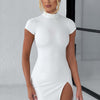 A fresh, elevated style you'll be obsessed with, meet the Mai mini. Made in our premium, super thick jersey that hugs your figure like a second skin, the dress has a high neckline, short sleeves and a thigh high split, The look is complete with a showstopping cut out to the back and tie detail. Wear yours with a high, sleek pony and silver accessories.