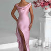 Marilyn is our gorgeous off the shoulder creation, made in our luxury bias cut satin which drapes beautifully over the body and gives an elegant, draped skirt. With subtle gathers and an ultra thigh high split for added sexiness, wear her with sleek hair and minimal jewellery.