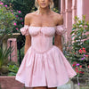 Must-have milkmaid minis are what we're wearing ALL season with sleek waves and mule heels. Penelope has dreamy puffed sleeves with a snatched waist and pretty tie detail to the bust. The look is complete with a voluminous skirt.