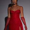 Sparkle into the night wearing the show stopping Pixie mini (red sparkle), a dress cut from our special custom mesh with all-over sparkle detail. The fit skims over your figure, flaring ever so slightly at the skirt with a small split for just the right amount of leg. Pixie is complete with underwired cups to frame and lift the bust. Style with the Pixie gloves and your highest heels.