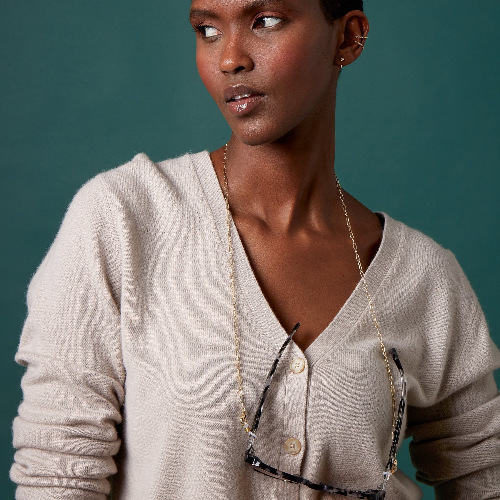This trendy 30 inches long eyeglass chain comes with an adaptor that can be easily be removed to wear the chain alone or layered with other jewelry.