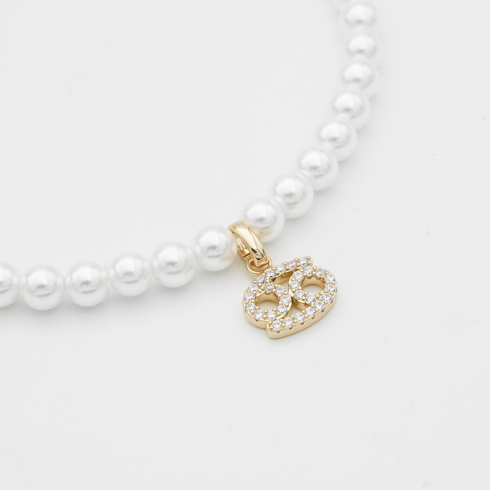 This stunning necklace features a custom zodiac sign pendant encrusted with cubic zirconia crystals, set on a pearl chain. A stylish way to showcase your individuality and love for astrology. This versatile necklace is perfect for dressing up any outfit and makes a heartfelt gift for someone special.