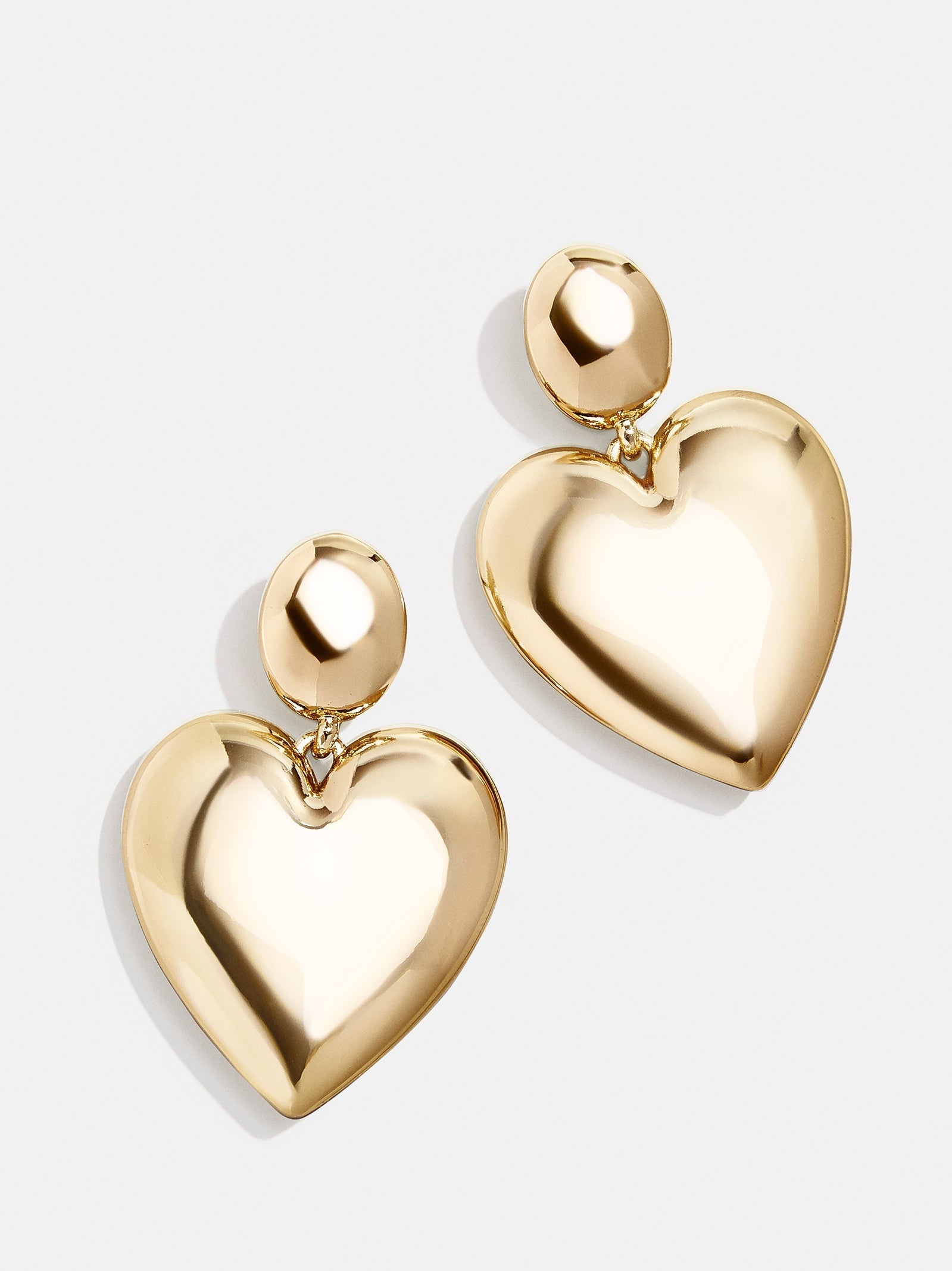 The Sheri Earrings make heart earrings modern. This pairing of gold drop earrings features a simple stud connected to an elegantly oversized glossy gold heart drop. We love this style for date night, girls' night, or really any night, as a matter of fact.