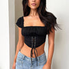 Feeling playful in the Maci Crop! She offers elasticated, frilly cap sleeves, double lined material, tie up detail down the centre and a zip up back. Match her with low rise denim jeans, white sandals and a shoulder bag to go with.