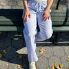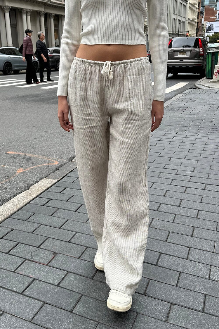 Wide leg white and blue striped linen pants with a drawstring waist, and side pockets.