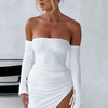 Take things to the next level in cool, feminine staples you wear again and again. The Becca mini is made in our signature double layered jersey that hugs the figure, featuring ruched detailing, off the shoulder styling, long sleeves and tie detailing. Keep things super sleek and simple with tonal mules and minimal jewellery.