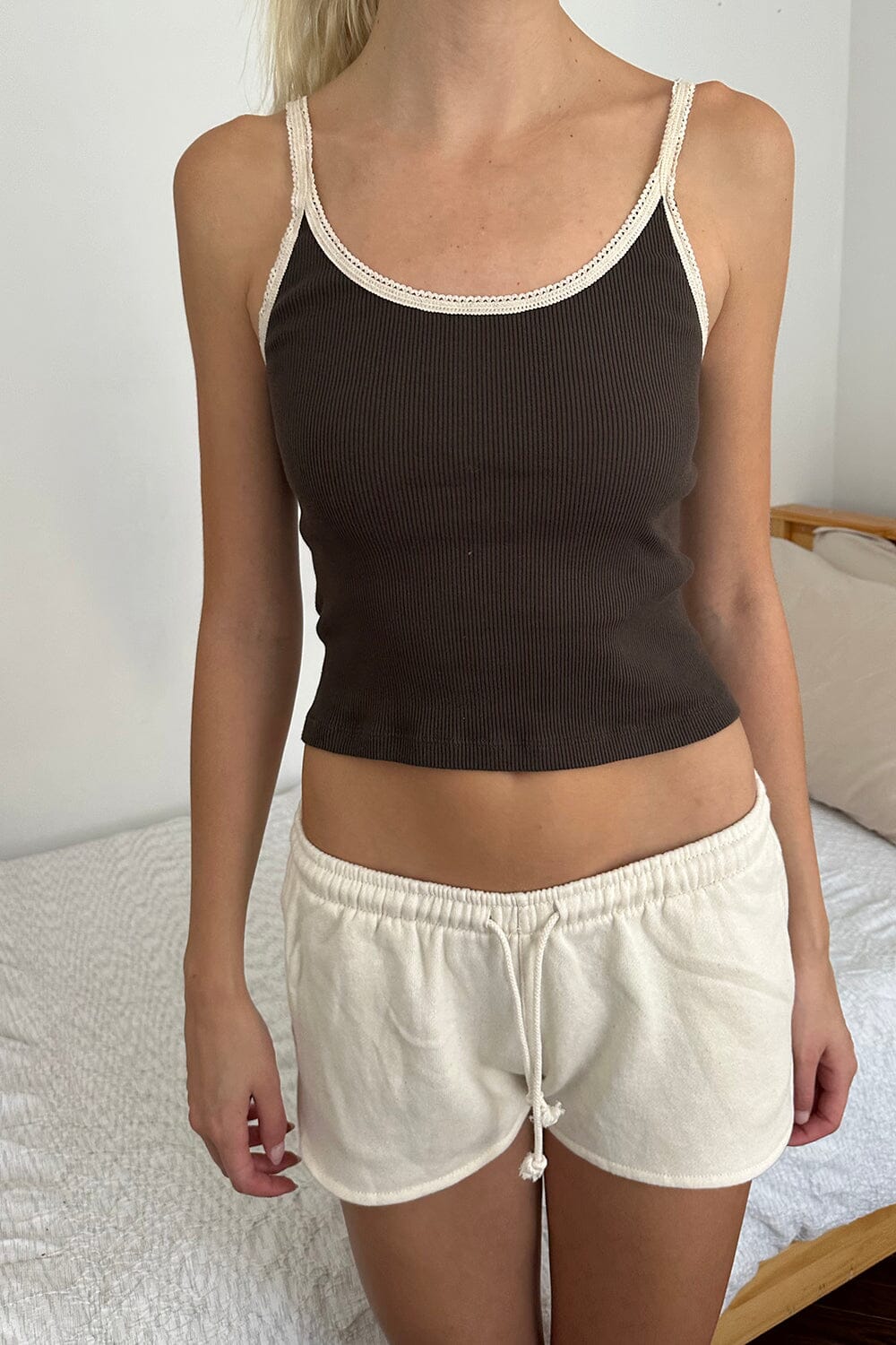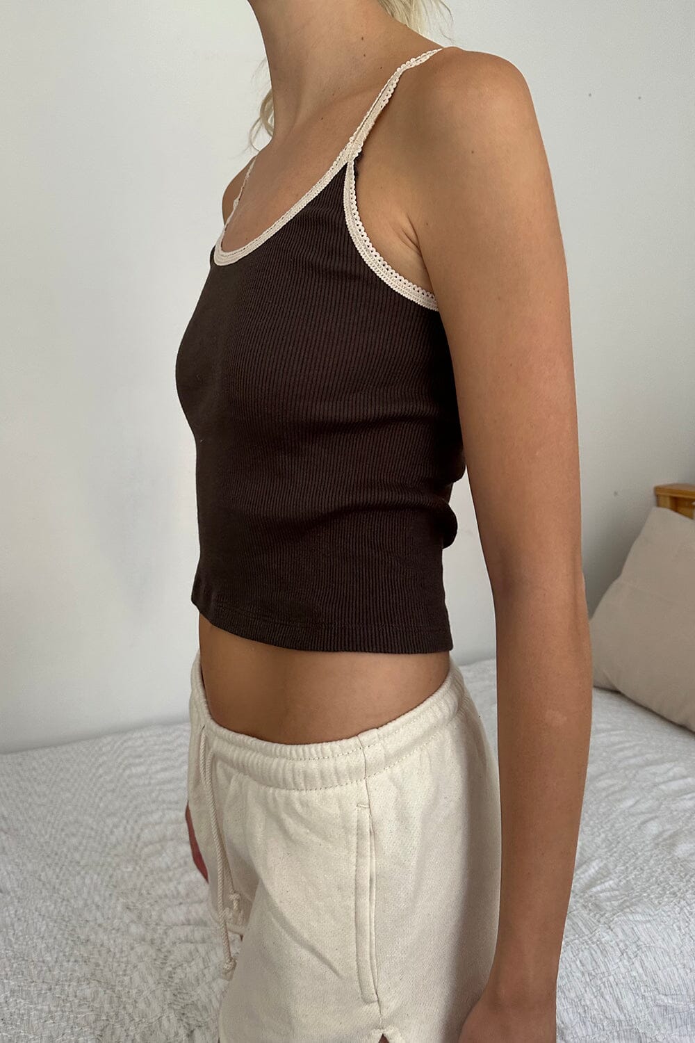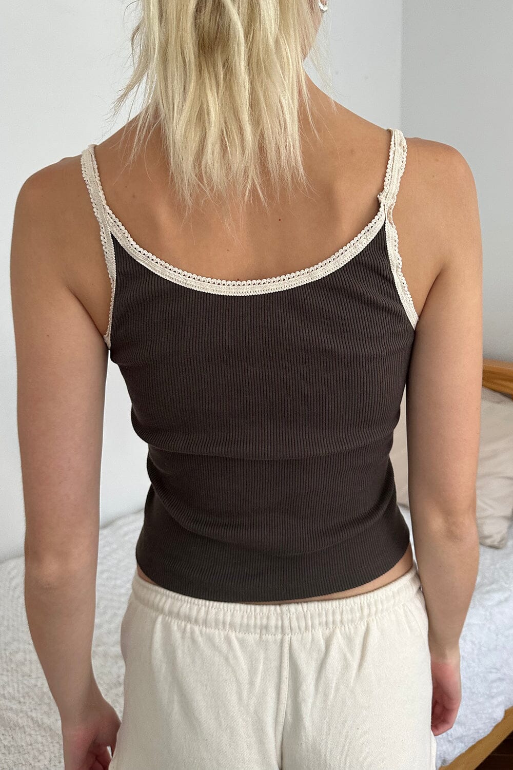 Basic, scoop-neck, ribbed, cotton tank top, with scalloped lace trim