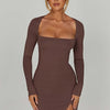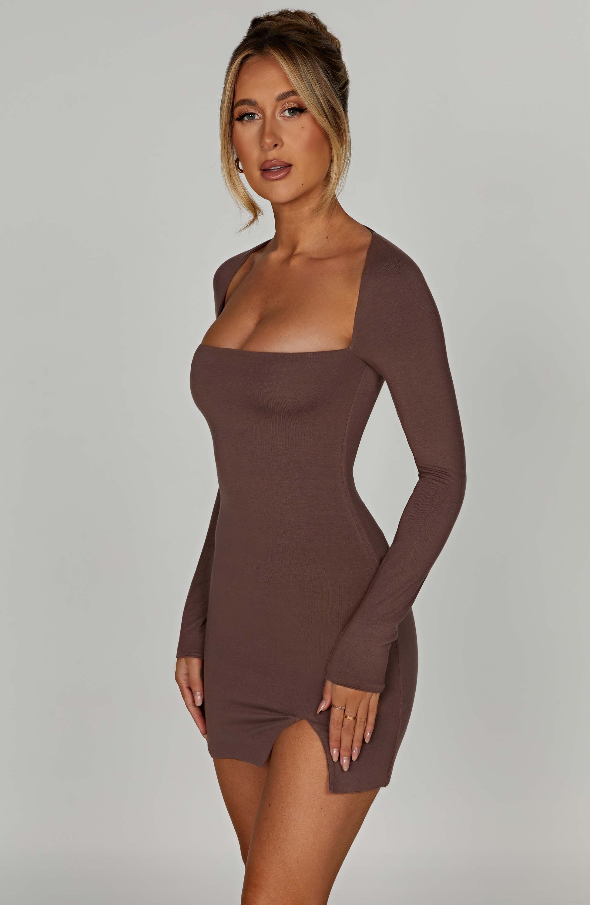 Introducing Brylee, everyone's new fave minimal mini to wear on repeat. Effortlessly dressed up or down, this sleek design has long sleeves and a square neckline to frame the bust. Made in our super smooth, buttery soft fabric that's double lined for a snatched-from-within feel, this mini will move with your body and is complete with a small thigh split.