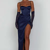 All attention, on you. The Despina maxi is a stunning choice for balls, formals, weddings and proms this season. Cut from luxury heavy satin with a stretch to skim over curves, this dreamy design is complete with a corset waist, thigh split, drape detail and underwired cups to lift and frame the bust. Style with glam waves and platforms.