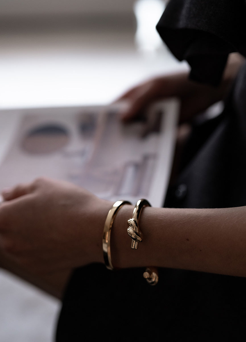 The Massive Knot cuff bracelet is a bold statement inspired by modern American Neo-Pop Art. Available in gold plated and polished steel.