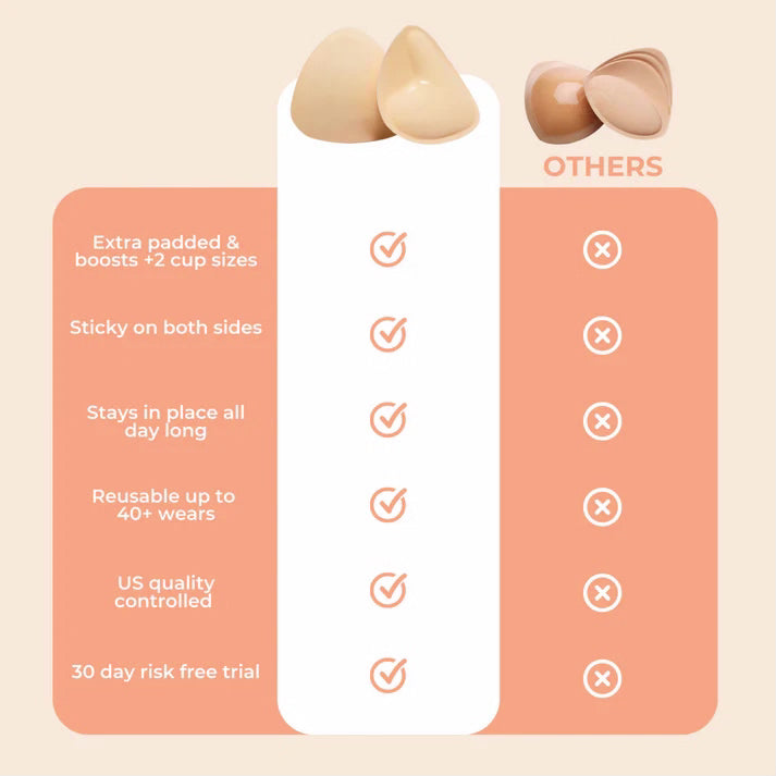 Sticky bra inserts are your secret weapon for achieving a shapelier, curvier, and sexier look. With a double-sided design for a secure hold, our bra inserts instantly add volume without the worry of a nip slip. Say hello to irresistible cleavage and constant head turns with this new fashion staple.