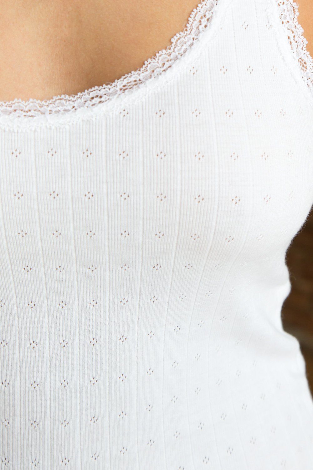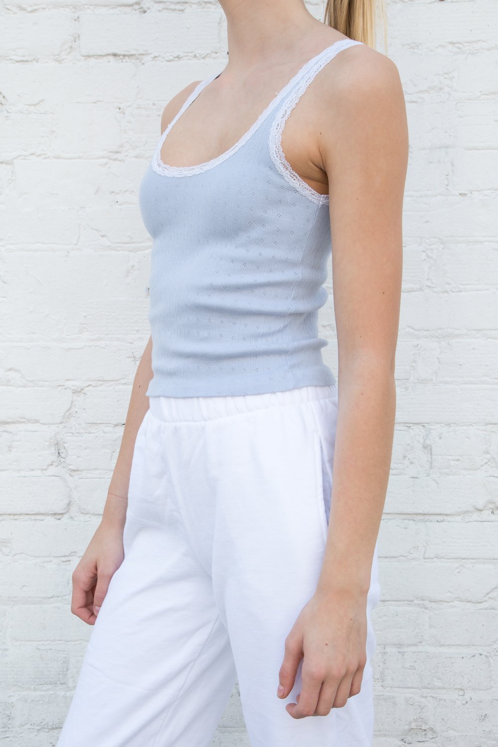 Soft cotton ribbed tank with white lace trimmings and eyelet detailing.