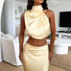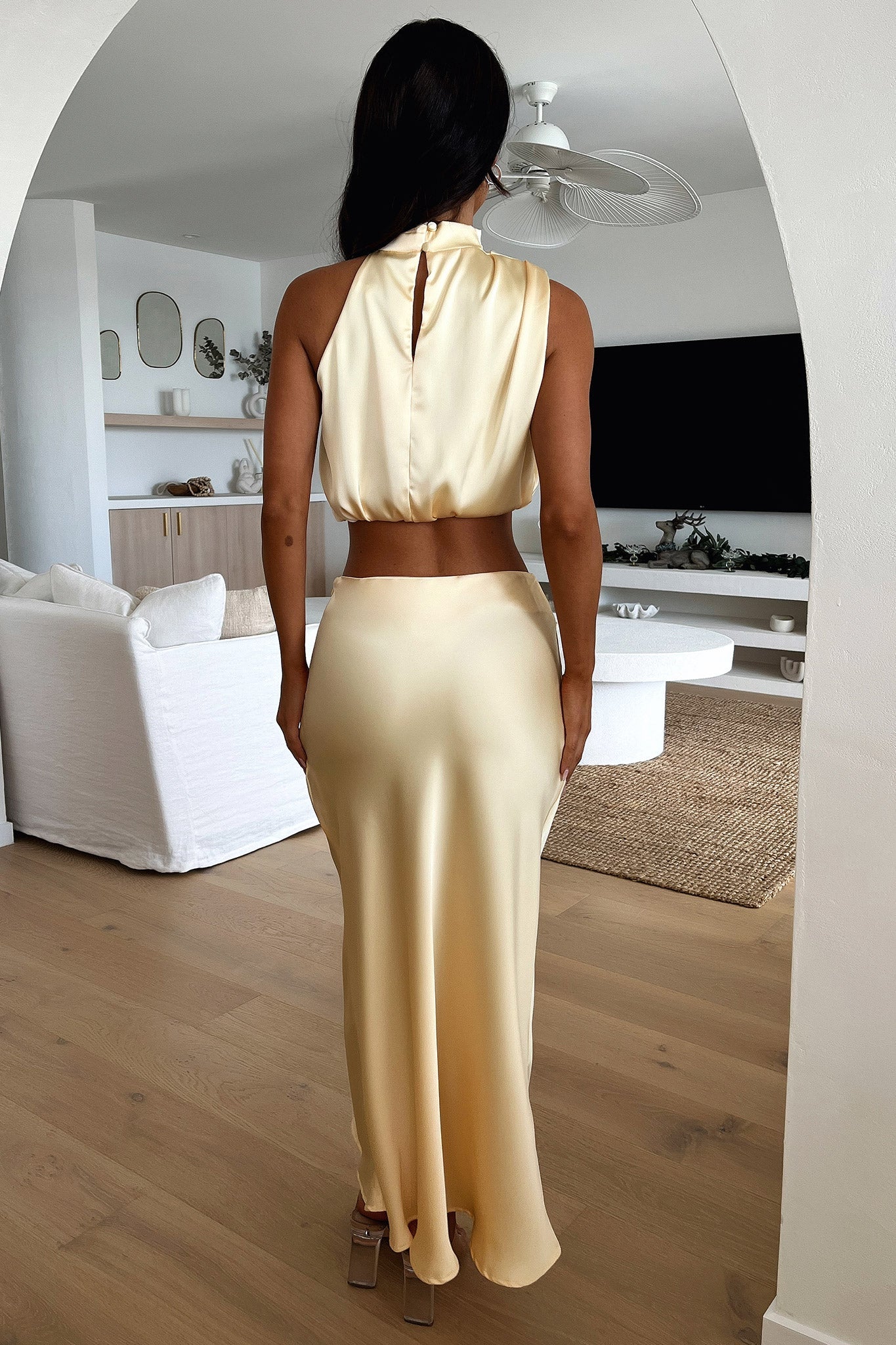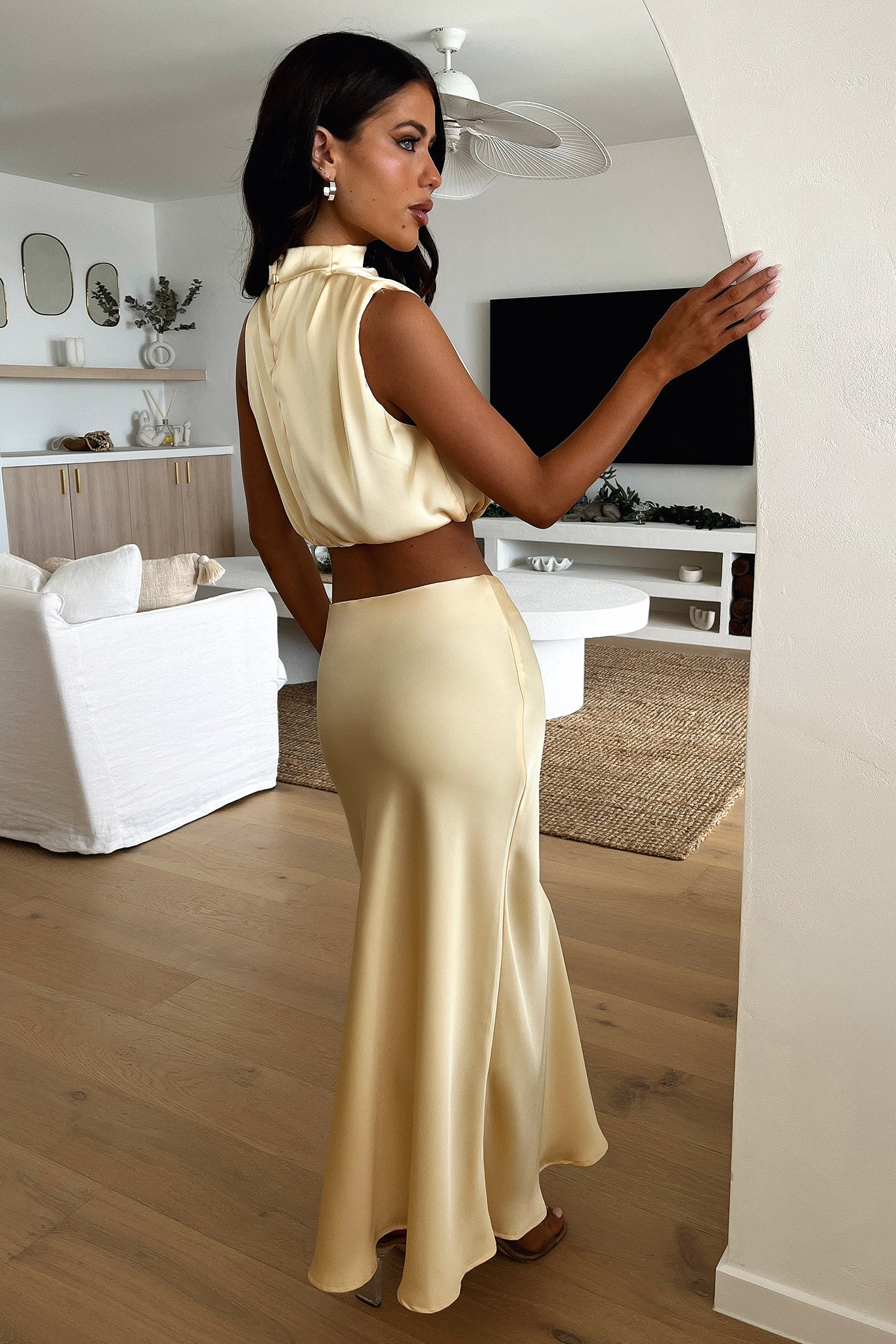 Sophisticated and classy, in the gorgeous Santorini Top! She features a high neckline with an asymmetrical sleeve cut, silky soft satin like material and a little cut out detail at the back with a button + zip closure. Pair her with the matching skirt, Black Heels and a bold Red lippy.