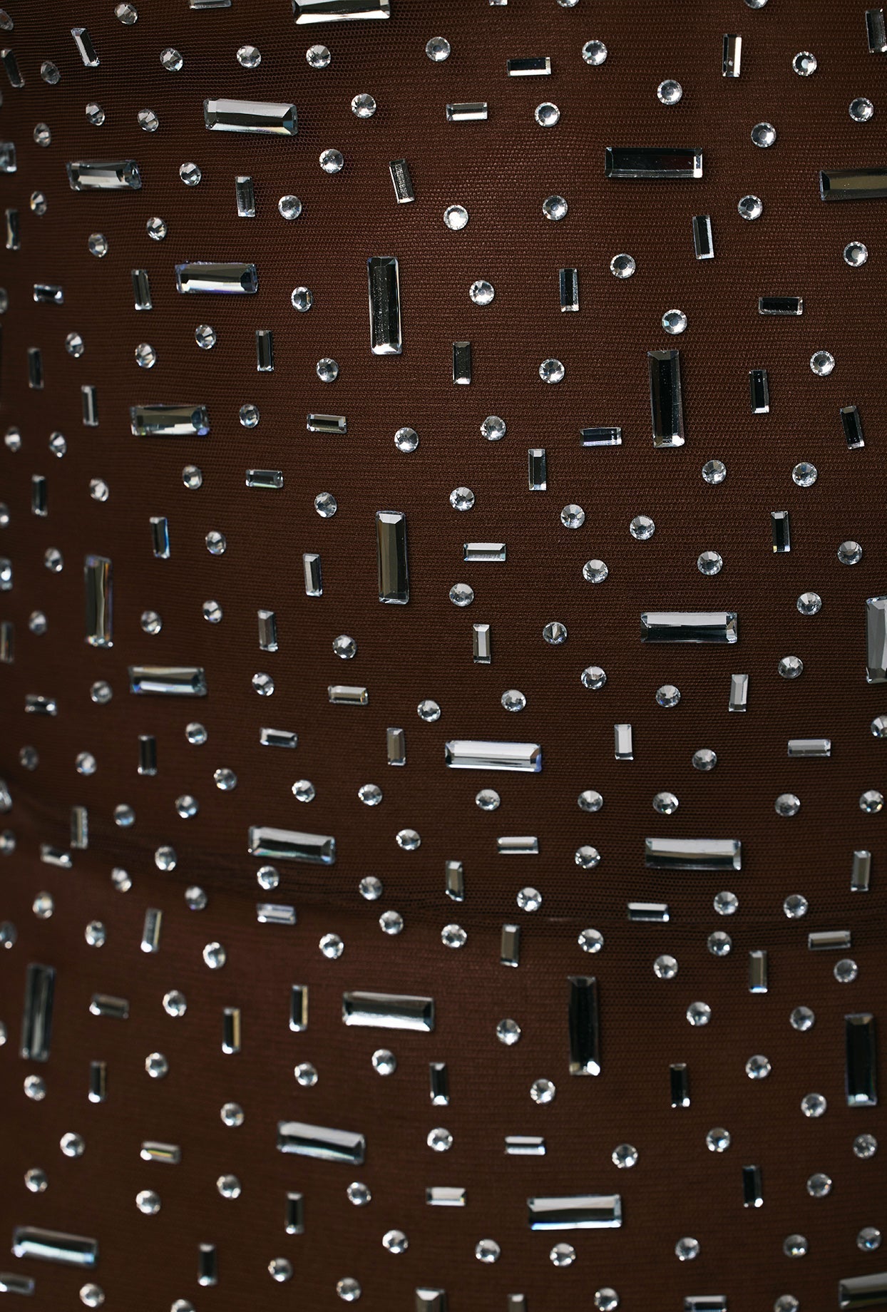 Sheer Embellished High Neck Evening Gown in Deep Cocoa