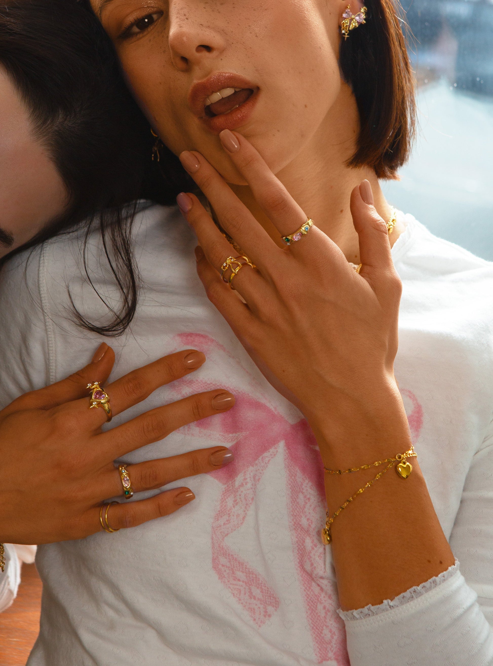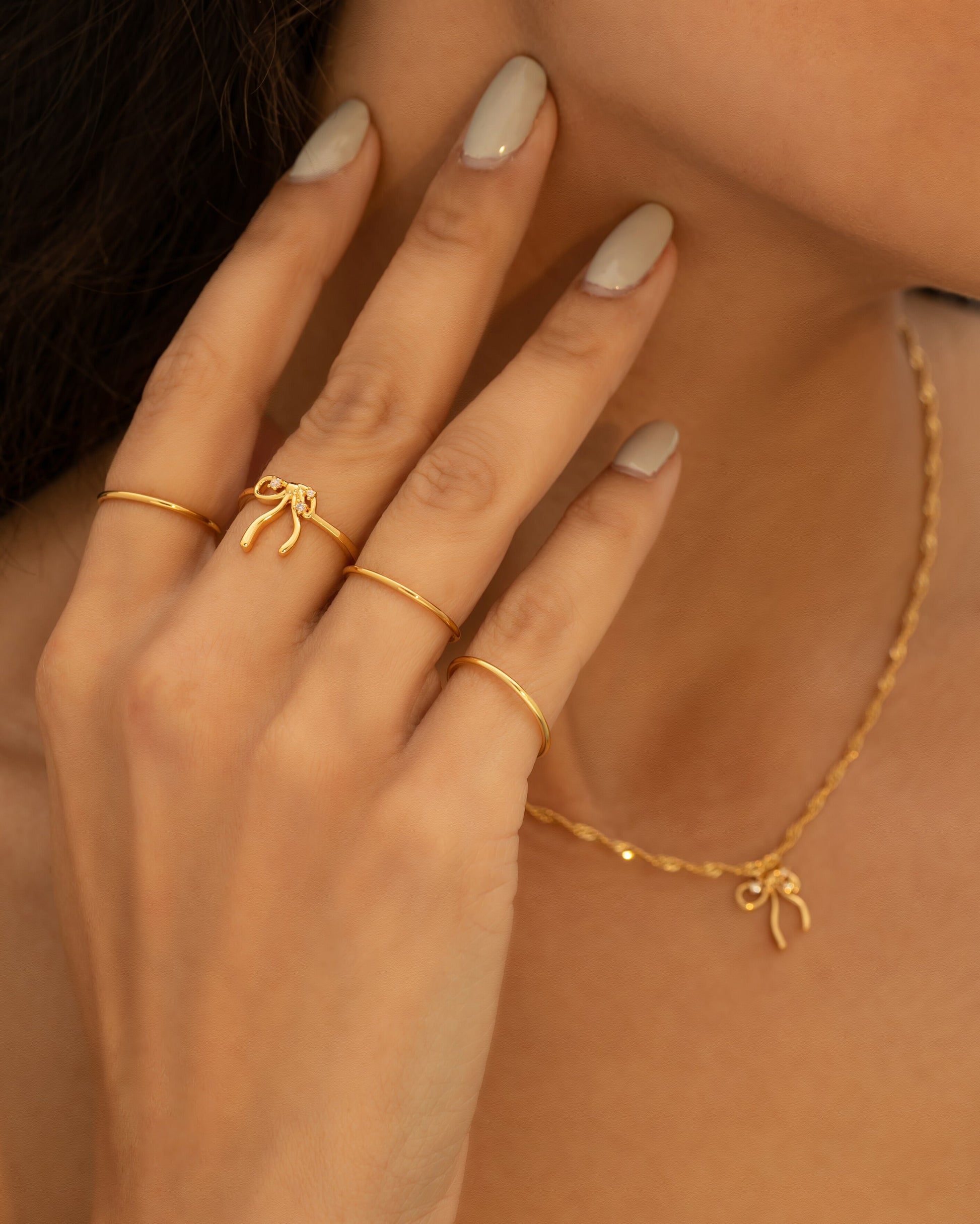 The fusion of a delicate ribbon motif with shimmering cubic zirconia stones elevates the contemporary balletcore aesthetic, providing an elegant addition to any modern ensemble.
