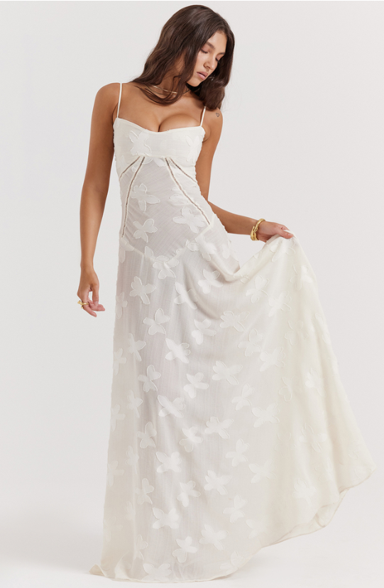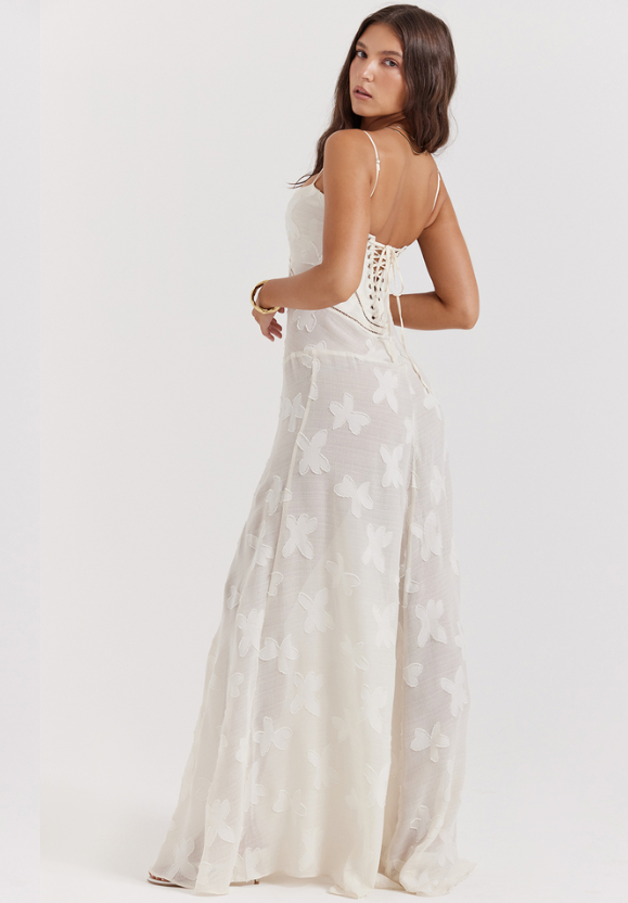 'Seren' is perhaps our most romantic dress yet and we're loving the corset inspired lace up back for a vintage feel. It's cut from a luxurious textured Jacquard in a vintage cream, embellished with floral blooms. 'Seren' features a delicate rouleau shoulder straps.